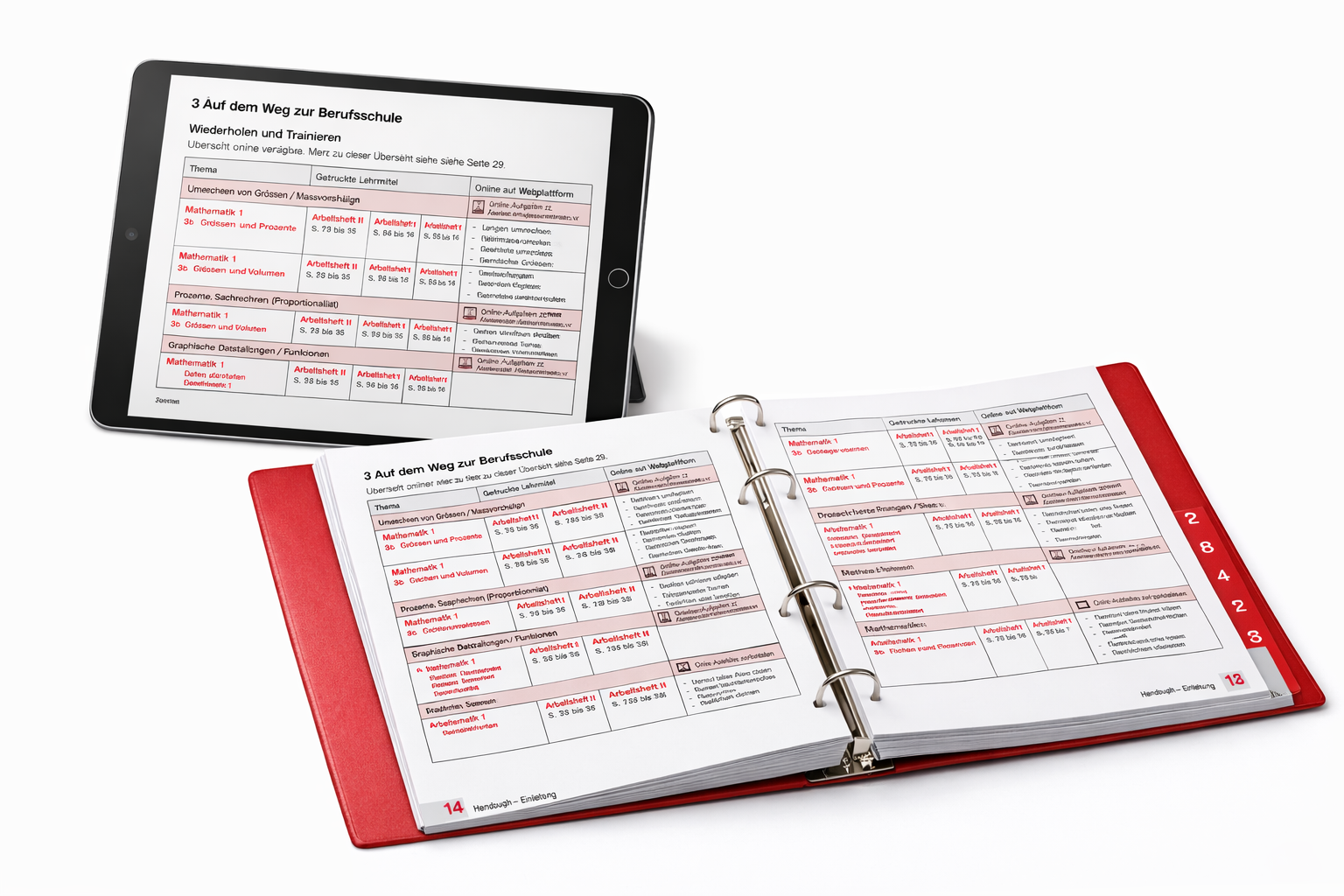 Als Hilfsmittel stellt die Übersicht die für einen technischen Beruf relevanten mathematischen Themen auf zehn Seiten tabellarisch dar. Sie verweist auf die Theorie mit Beispielen im Begleitheft des Lehrwerks «Mathematik 1–3 Sekundarstufe I» sowie auf ausgewählte Aufgaben in den gedruckten Arbeitsheften und auf die fast unbegrenzten digitalen Trainingsangebote. Die digitalen Materialen sind direkt in der Übersicht verlinkt. Die entsprechenden Aufgaben des jeweiligen Kapitels können auf der Übersicht angeklickt werden, so zum Beispiel bei Mathematik 1, Kapitel «3b Grössen und Prozente» im Register Arbeitsheft II.